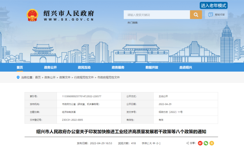 紹政辦發(fā)〔2021〕29號文件中的《加快推進(jìn)工業(yè)經(jīng)濟高質(zhì)量發(fā)展若干政策》《加快現代服務(wù)業(yè)高質(zhì)量發(fā)展若干政策》《加快科技創(chuàng )新若干政策》《金融支持經(jīng)濟高質(zhì)量發(fā)展若干政策》《鼓勵支持開(kāi)放型經(jīng)濟發(fā)展若干政策》及紹政辦發(fā)〔2020〕36號文件中的《紹興市促進(jìn)建筑業(yè)企業(yè)轉型升級加快推進(jìn)建筑產(chǎn)業(yè)發(fā)展若干政策》同時(shí)廢止。